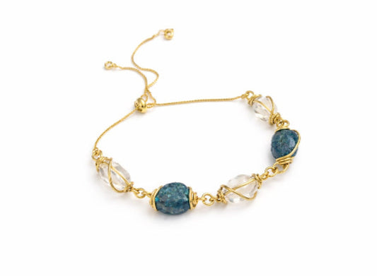 A cool white and blue crystal bracelet accented with non tarnish gold wire wrap. Pretty...