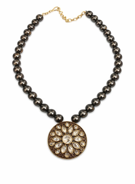 A minimalistic grey Hemetite string anchors a circular kundan pendant. Simple yet glamorous. TSP-151...