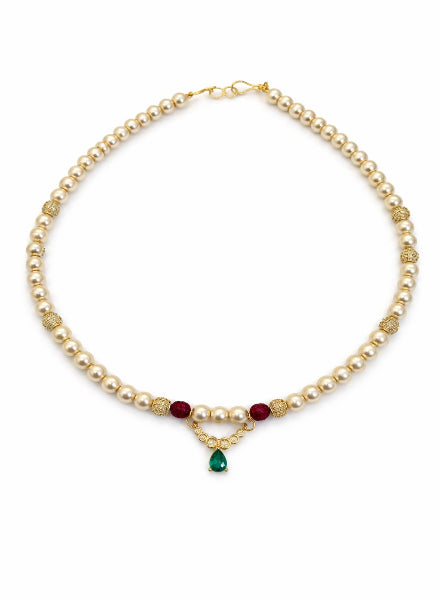 A delicate pearl necklace is accented with ruby pave beads and a small faux emerald...