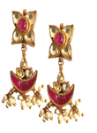 A stunning ruby and green onyx crescent necklace, accented with pearl lusters. Paired with a delicate pair of drop earrings.